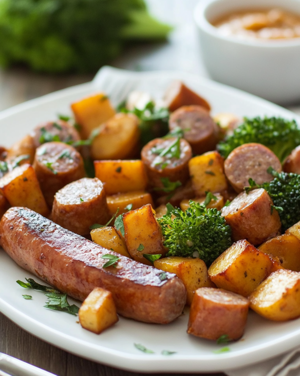Knusprige Wurst-Süßkartoffel-Blechpfanne mit Honig-Knoblauch-Sauce genießen!