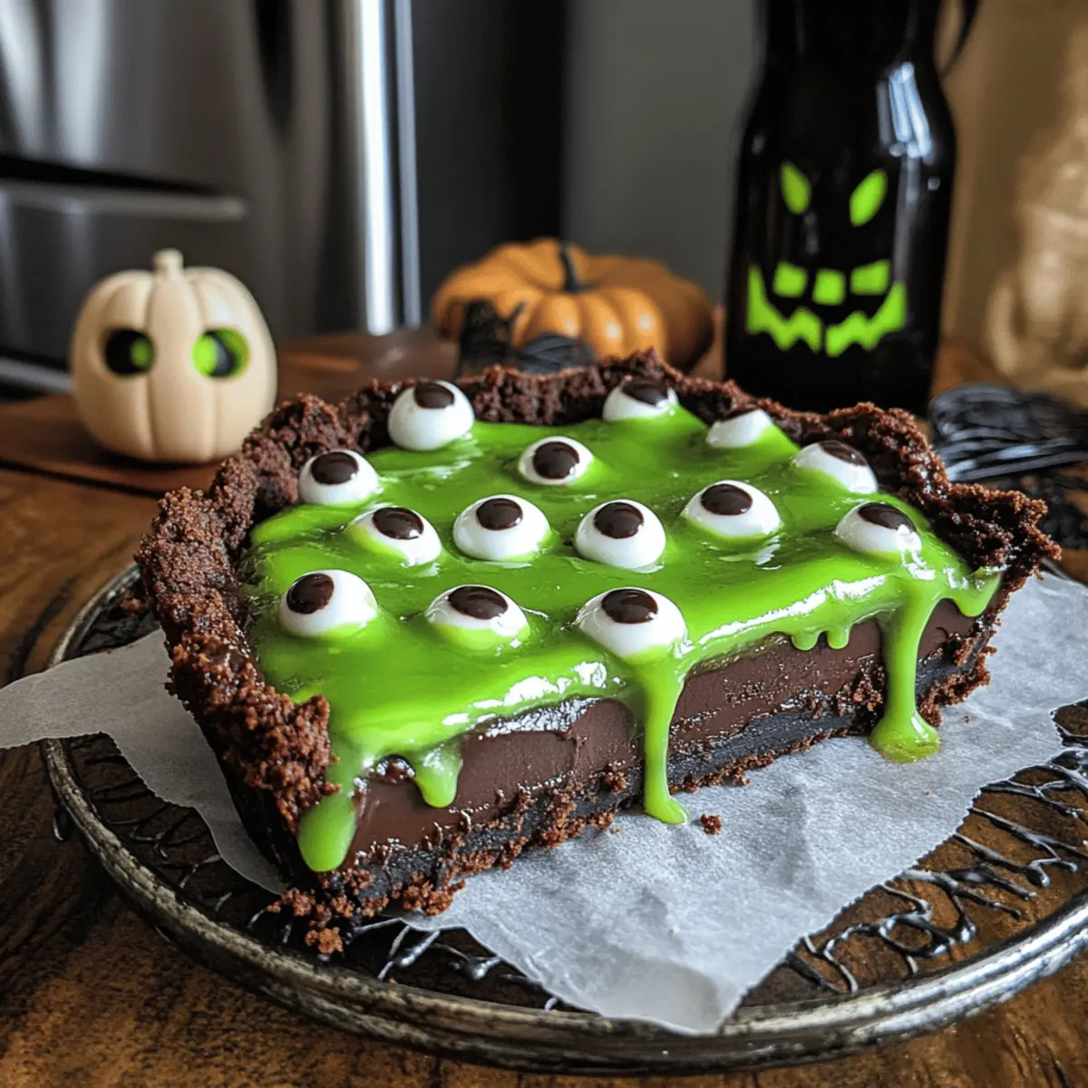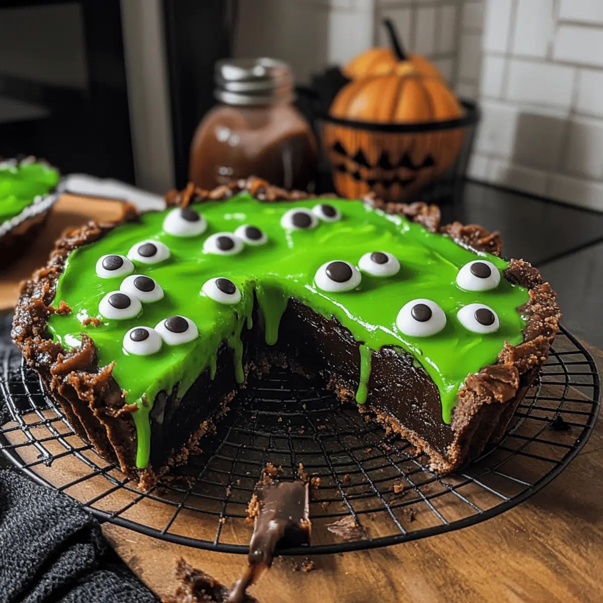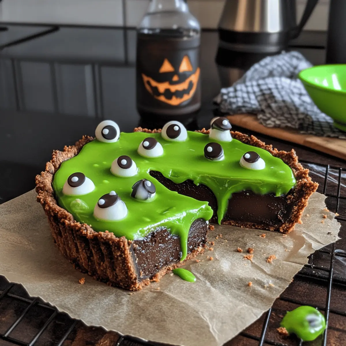 Cremige Halloween-Schokoladentarte mit Schleim-Monstern