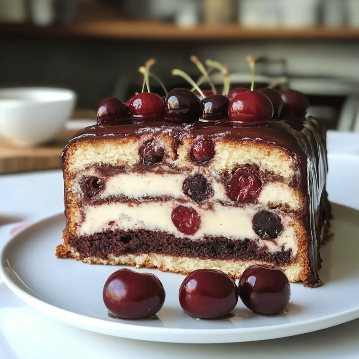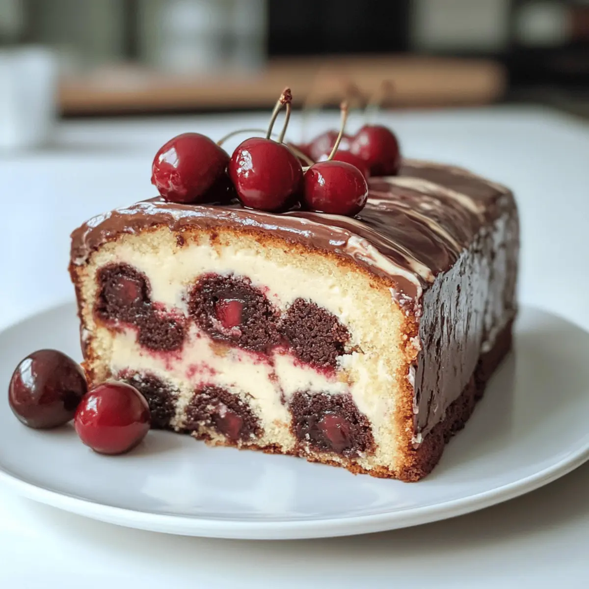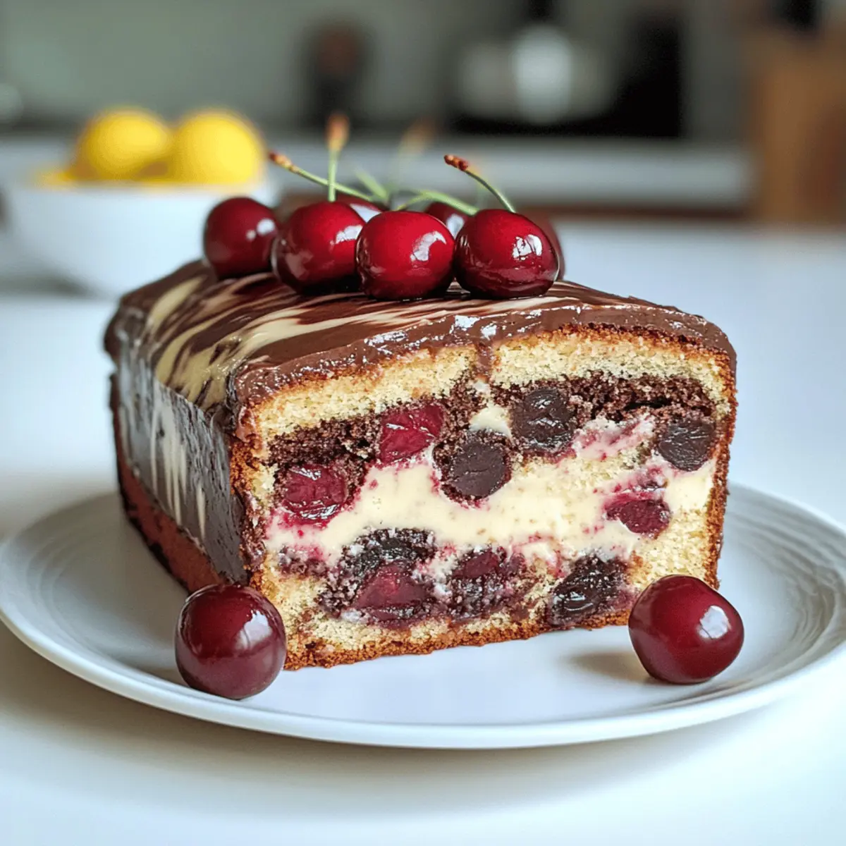 Entdecke das köstliche Donauwelle Kastenform Rezept für einen saftigen Marmorkuchen mit Frischkäsefüllung und Kirschen.