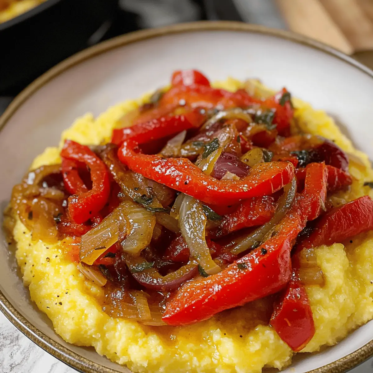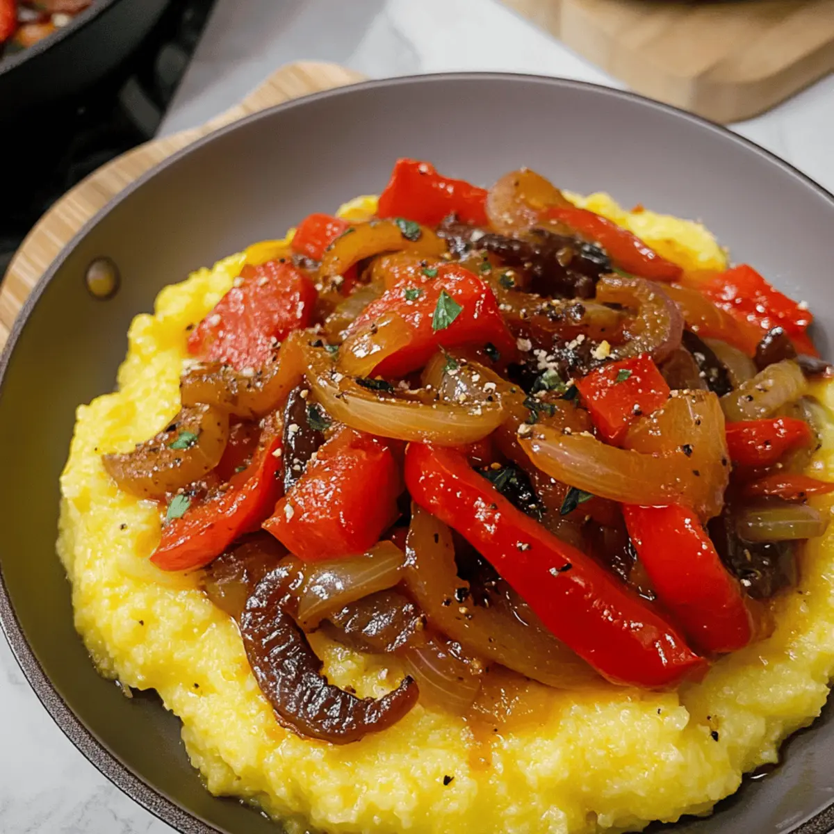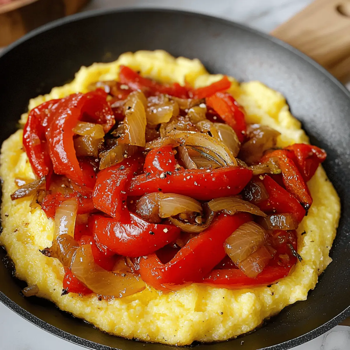 Schritt-für-Schritt-Anleitung für Geschmorte Paprika-Zwiebel-Pfanne auf cremiger Polenta