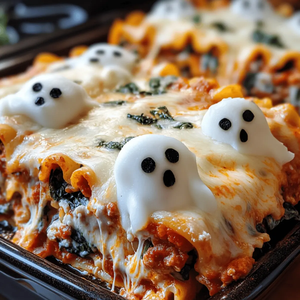 Aufwärmen:: Um die Lasagne wieder aufzuwärmen, backe sie bei 180 °C (350 °F) für etwa 25-30 Minuten, bis sie durchgehend heiß ist. Die Geister können in den letzten Minuten hinzugefügt werden, um ihre Form zu erhalten.