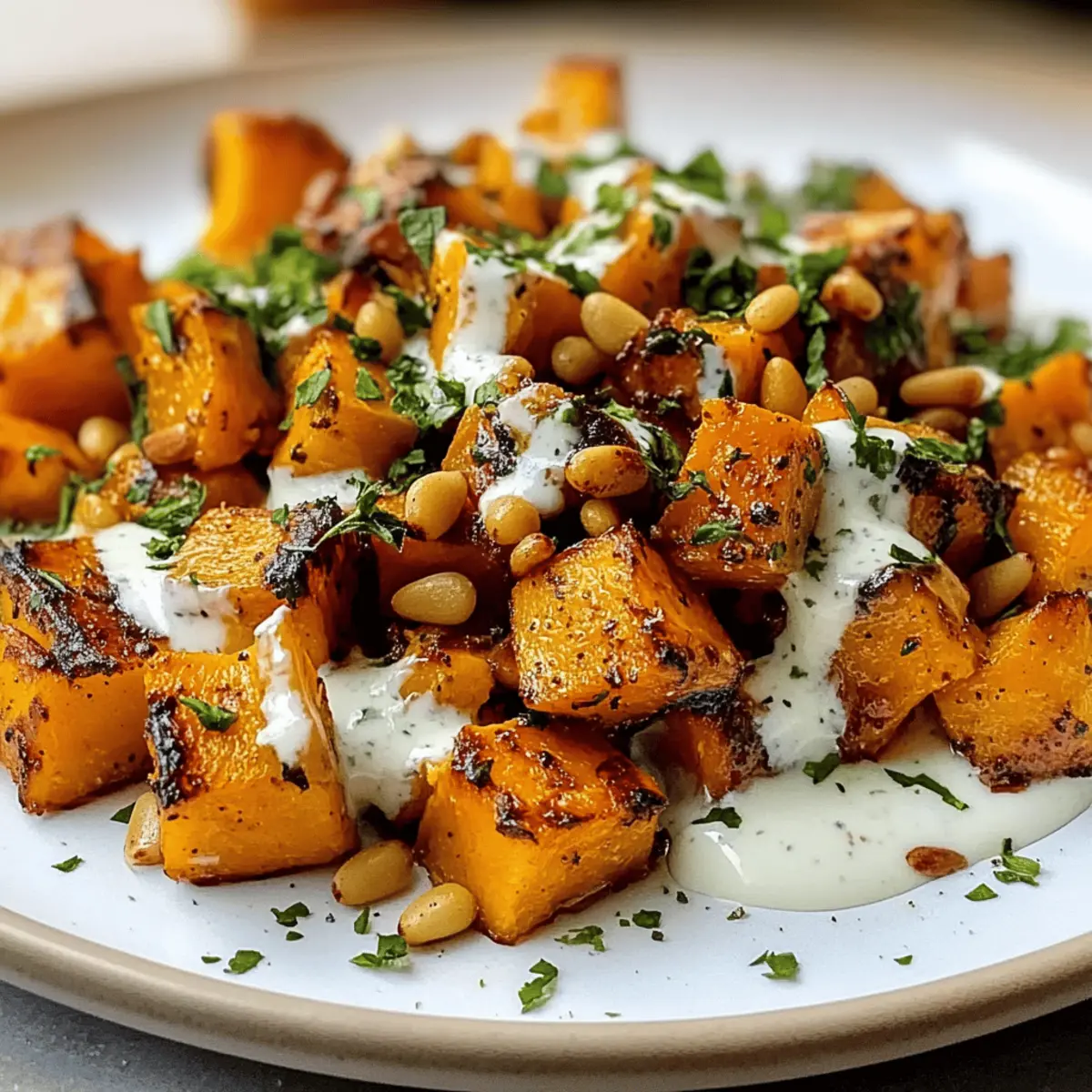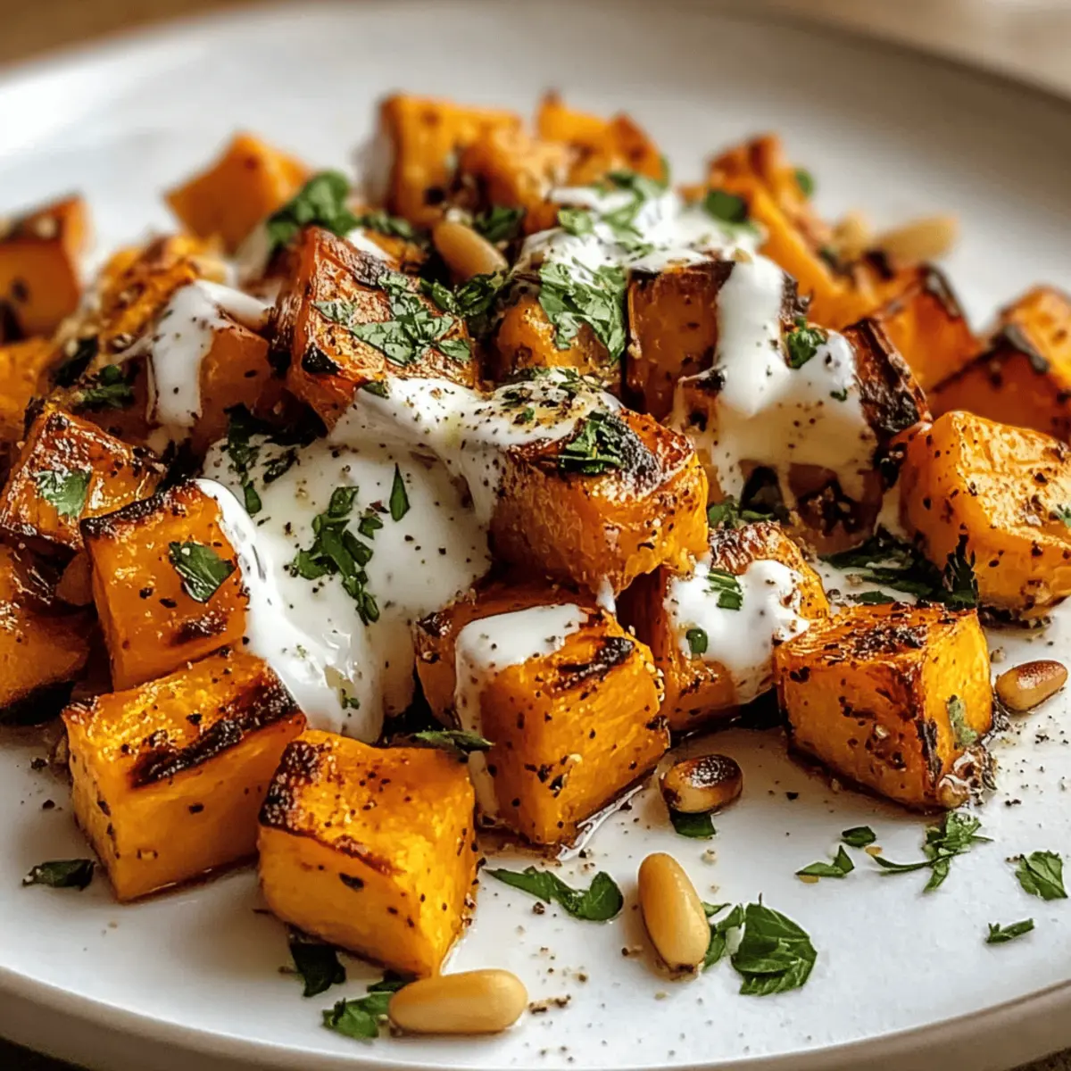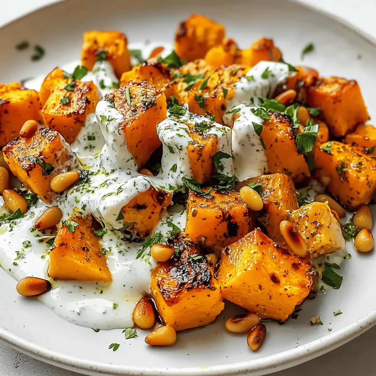 Mach dich bereit, diesen köstlichen goldbraun gerösteten Kürbis mit Joghurtsauce zuzubereiten!