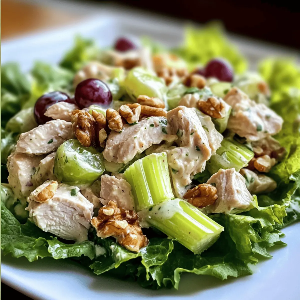 Achte darauf, frisches Gemüse und hochwertiges Hähnchen zu verwenden. Der Sellerie sollte knackig und hellgrün sein, während die Trauben fest und ohne dunkle Stellen sein sollten. Idealerweise nimmst du Hähnchenbrust, die du entweder grillst oder kochst, bis sie vollkommen durchgegart ist (mindestens 75 °C).