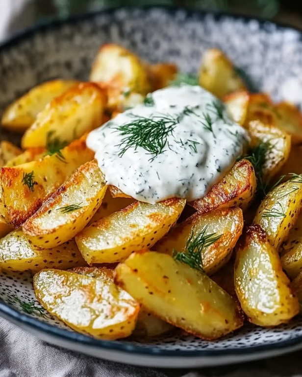 Servieren Sie die Kartoffelspalten in einer großen Holzschale oder auf einem rustikalen Holzbrett. Dies verleiht dem Gericht eine gemütliche Atmosphäre. Platzieren Sie den Gurkendip in einer kleinen Schüssel in der Mitte. Dekorieren Sie die Platte mit frischen Kräutern wie Petersilie oder Dill für einen zusätzlichen Farbtupfer.