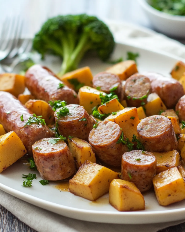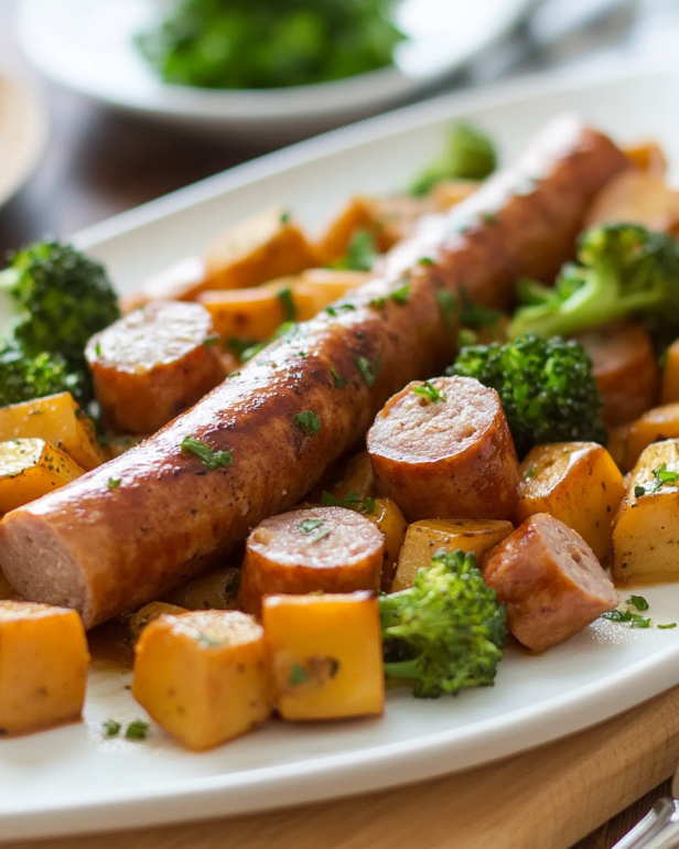 Einführung in die Knusprige Wurst-Süßkartoffel-Blechpfanne mit Honig-Knoblauch-Sauce