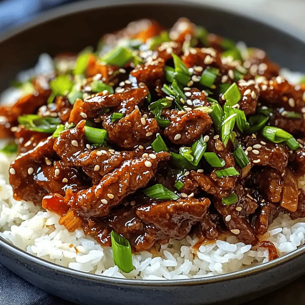 - Serviere das Rindfleisch über dem fluffigen Reis und garniere es mit Frühlingszwiebeln oder Sesamkörnern.