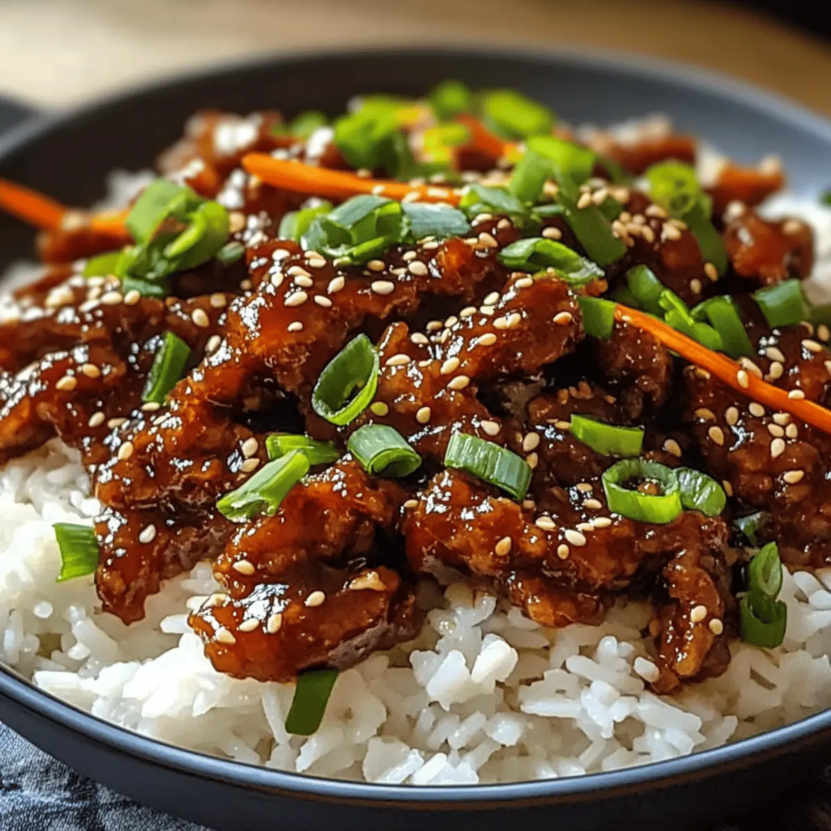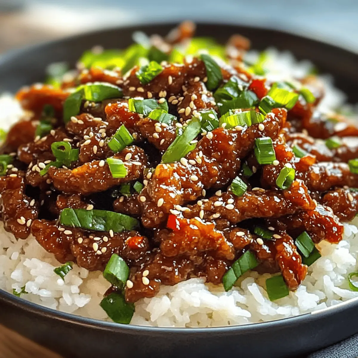 Garniertipps: Frisch gehackte Frühlingszwiebeln oder geröstete Sesamkörner sorgen für zusätzlichen Geschmack und Textur in deinem Knusprigen Chili-Rindfleisch-Reis.