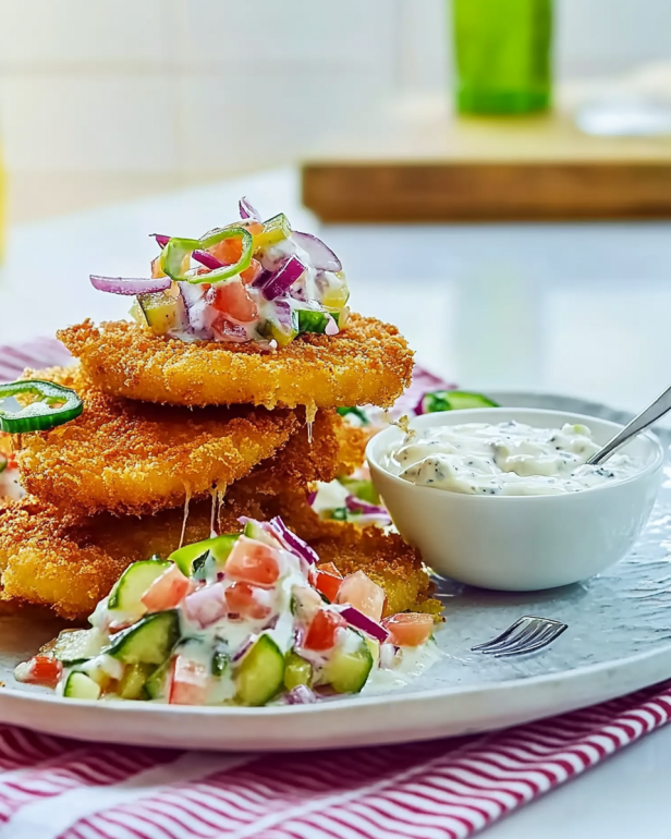 Jetzt sind Ihre Kohlrabi-Schnitzel bereit, serviert zu werden! Kombinieren Sie sie mit der Joghurt-Aioli und genießen Sie dieses köstliche Gericht.