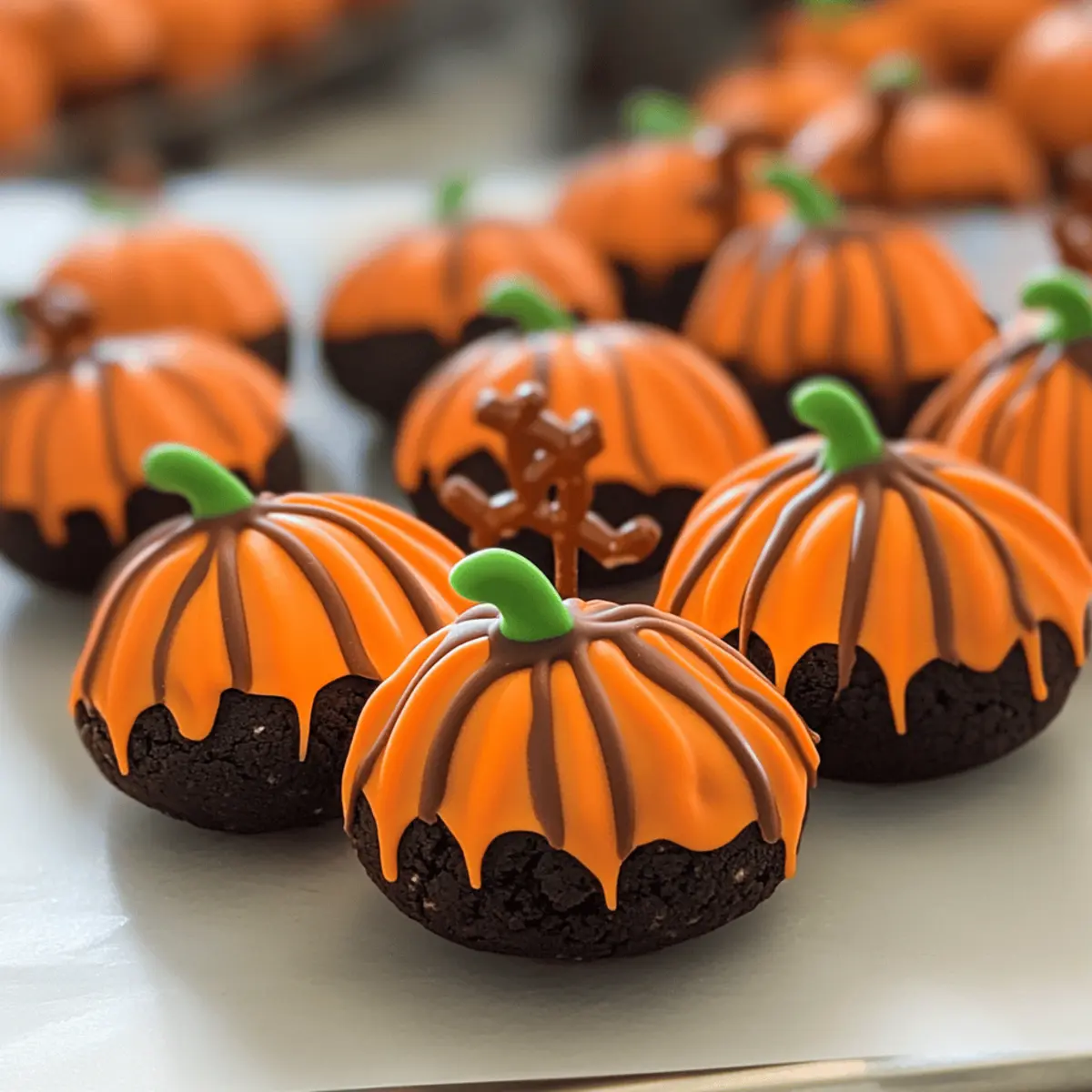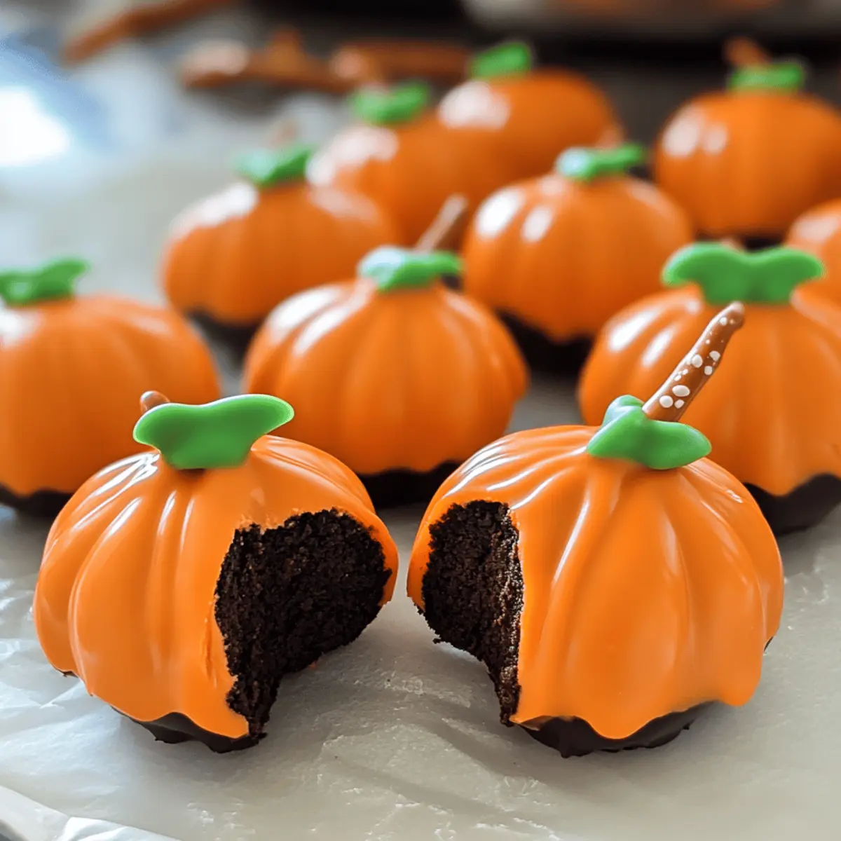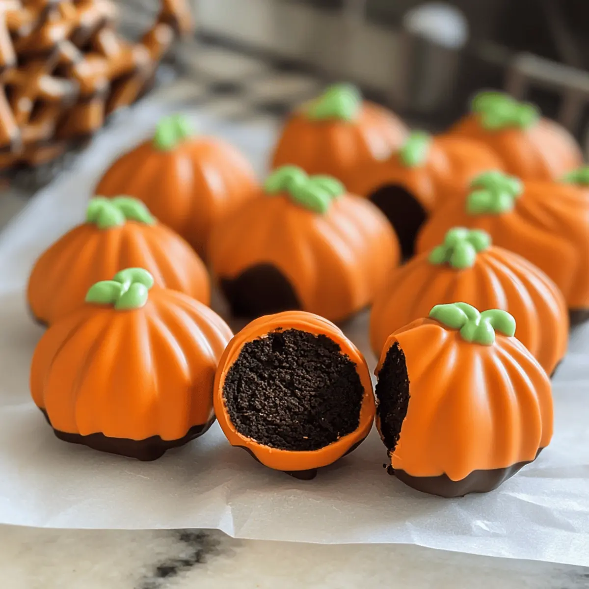 Fügen Sie sofort einen Brezelstift an die Oberseite jedes Bällchens als „Stiel“ hinzu. Sie können zusätzlich grüne Zuckerglasur oder kleine Süßigkeiten verwenden, um Blätter zu imitieren. Dies gibt den Kürbis Oreo Bällen den letzten Schliff und verleiht ihnen ein festliches Aussehen. Dieser Schritt dauert nur ein paar Minuten, bringt aber großen Spaß.