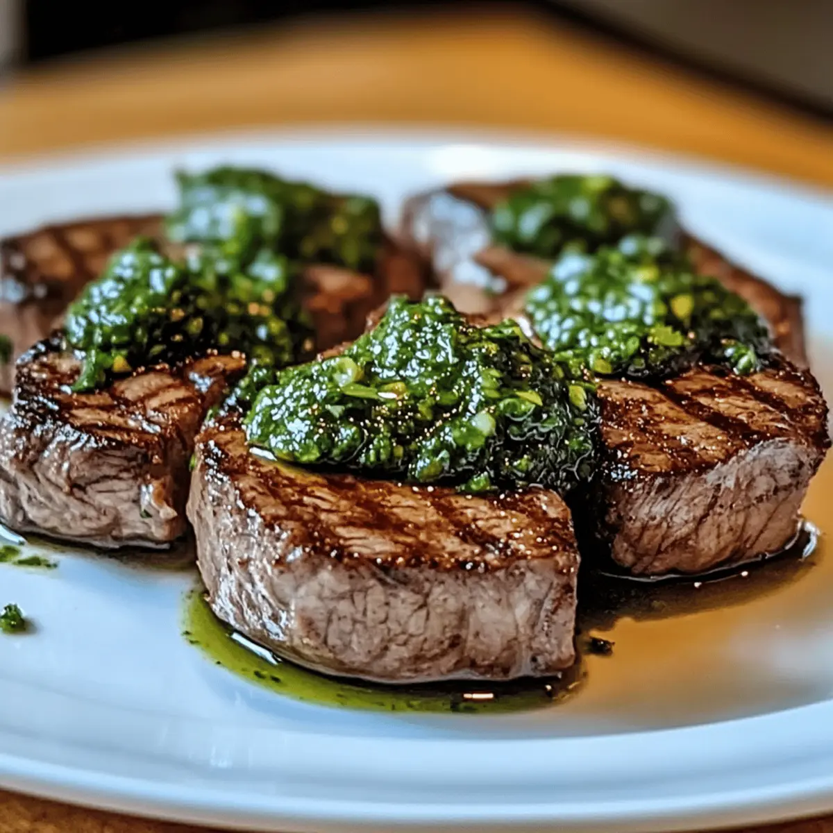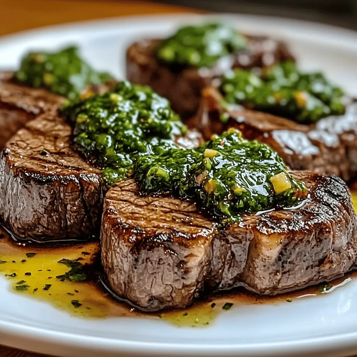 - Die Rindersteaks auf Tellern anrichten und großzügig mit Chimichurri-Sauce überziehen.