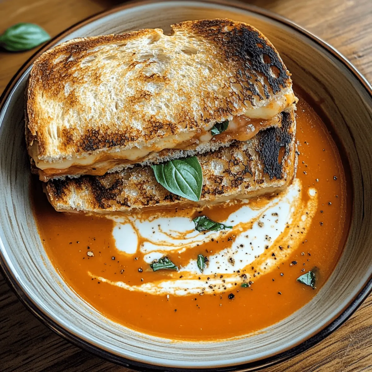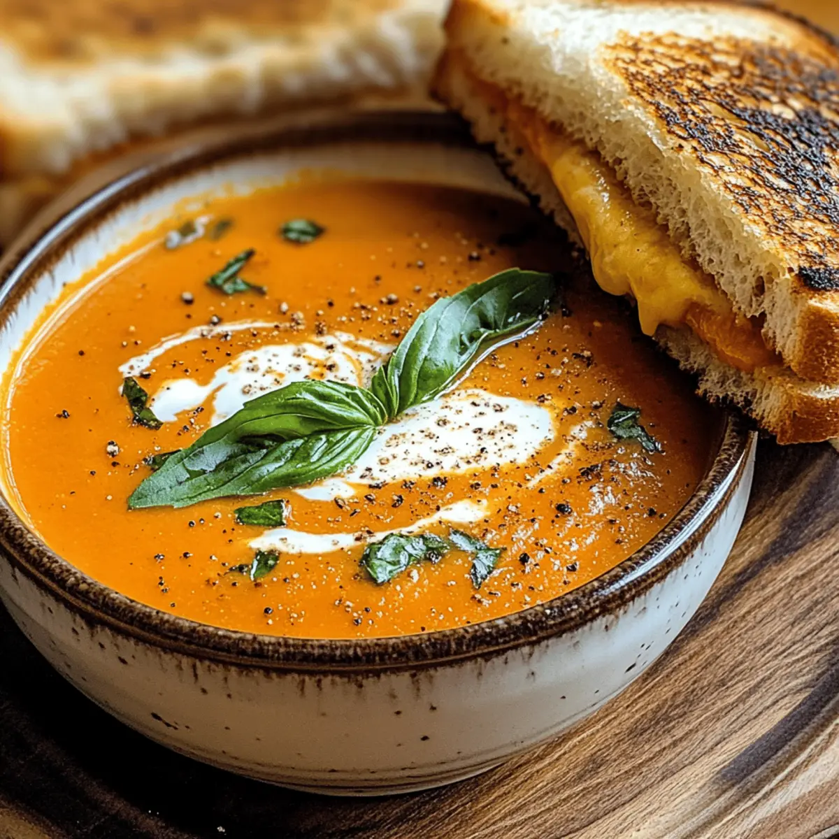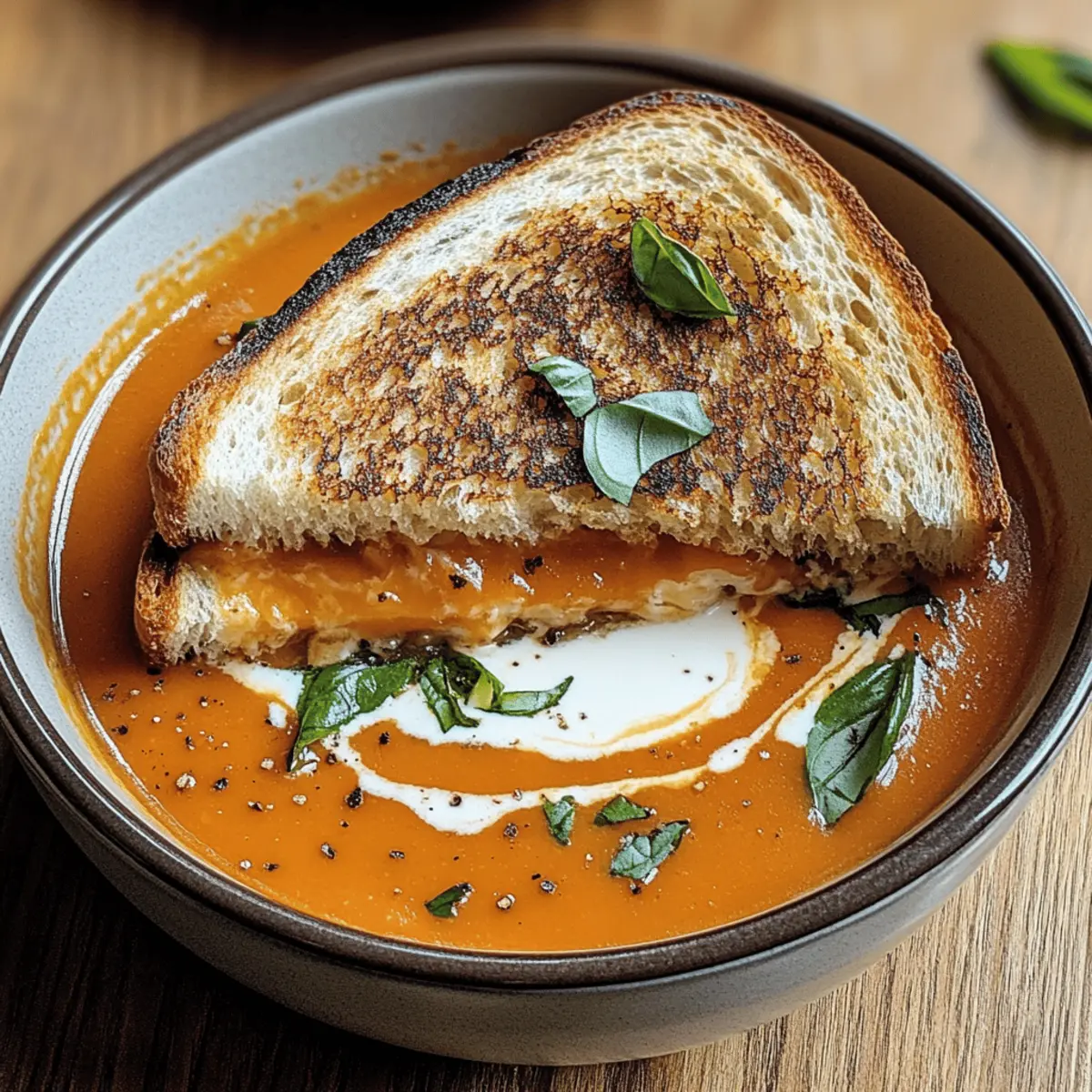 Genießen Sie die köstliche Kombination aus gerösteter Tomatensuppe und gegrilltem Käsebrot, ein wahrer Seelenwärmer für jeden Tag.