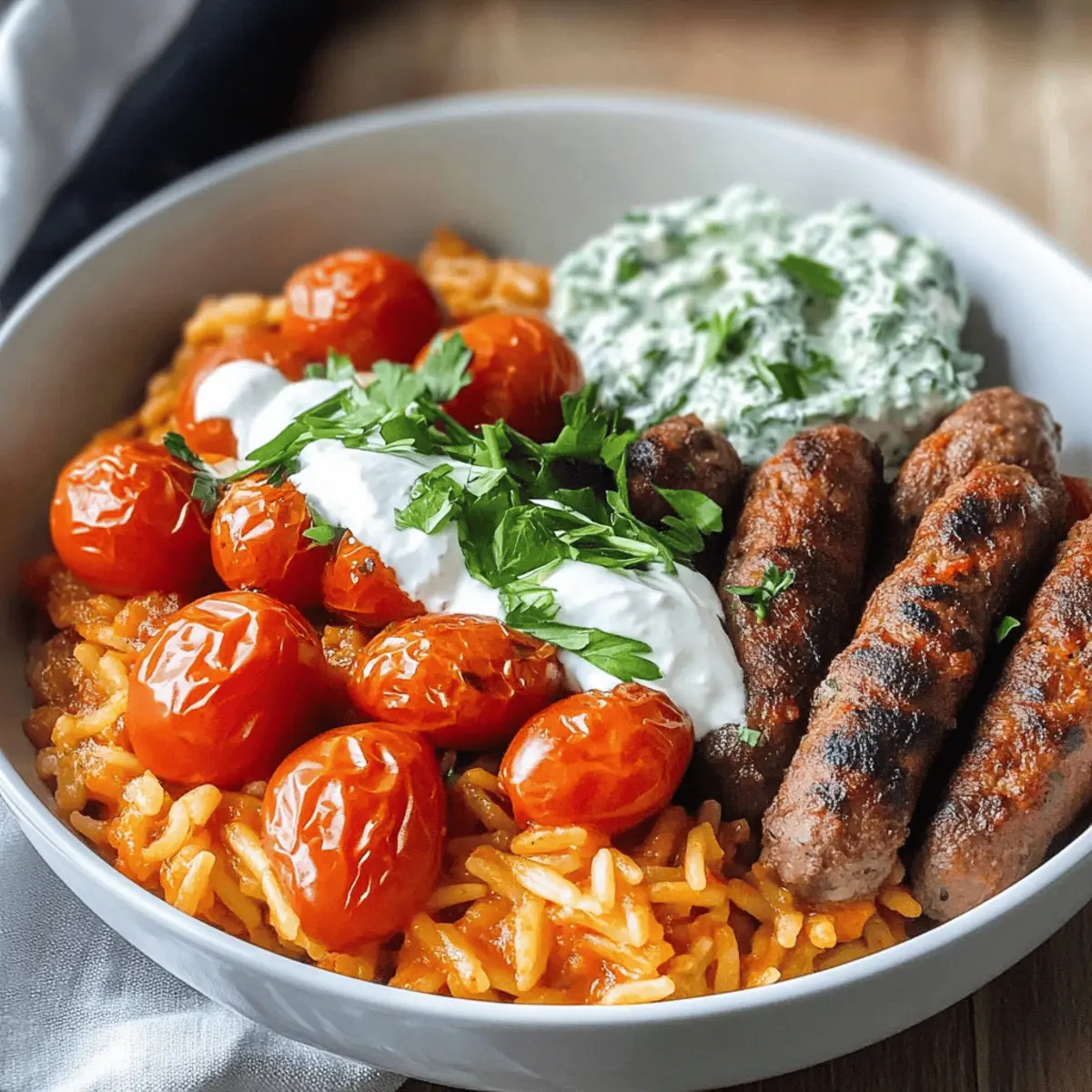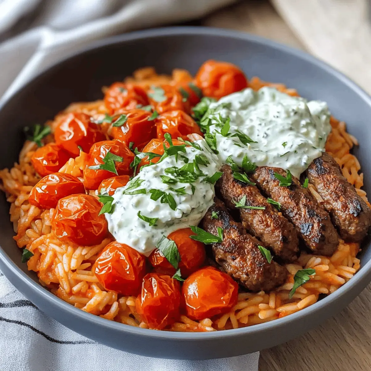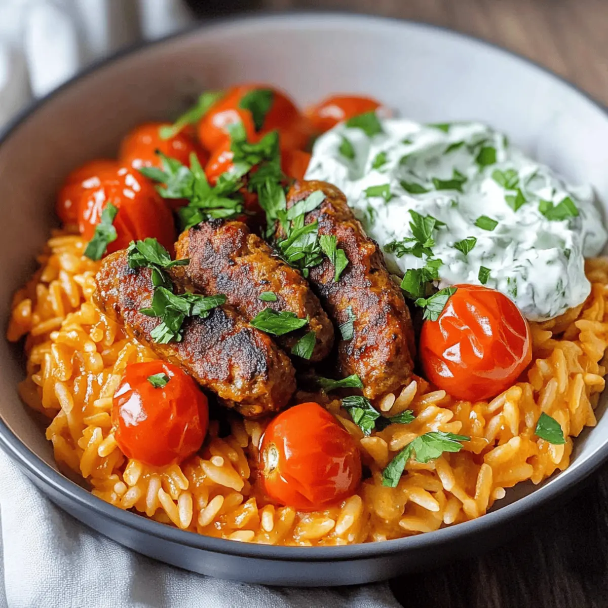 Entdecke die Vielfalt und den Geschmack dieser Tomaten Kritharaki mit veganen Cevapcici und Tzatziki!