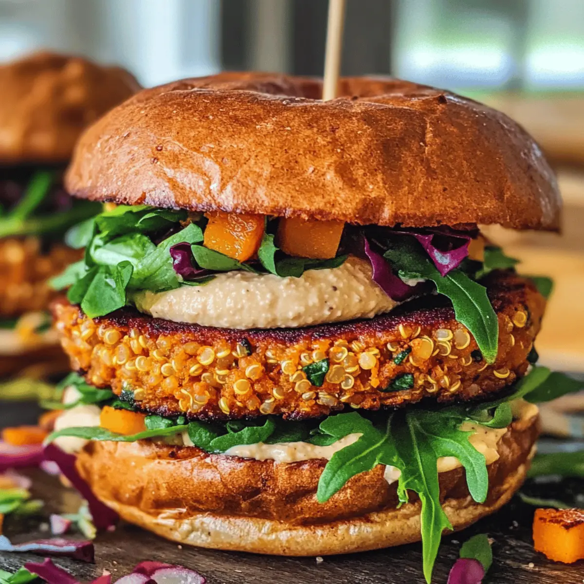 Genießt diesen veganen Kürbisburger, zubereitet mit Quinoa und Kichererbsen. Eine köstliche, nahrhafte Wahl für jeden Anlass.