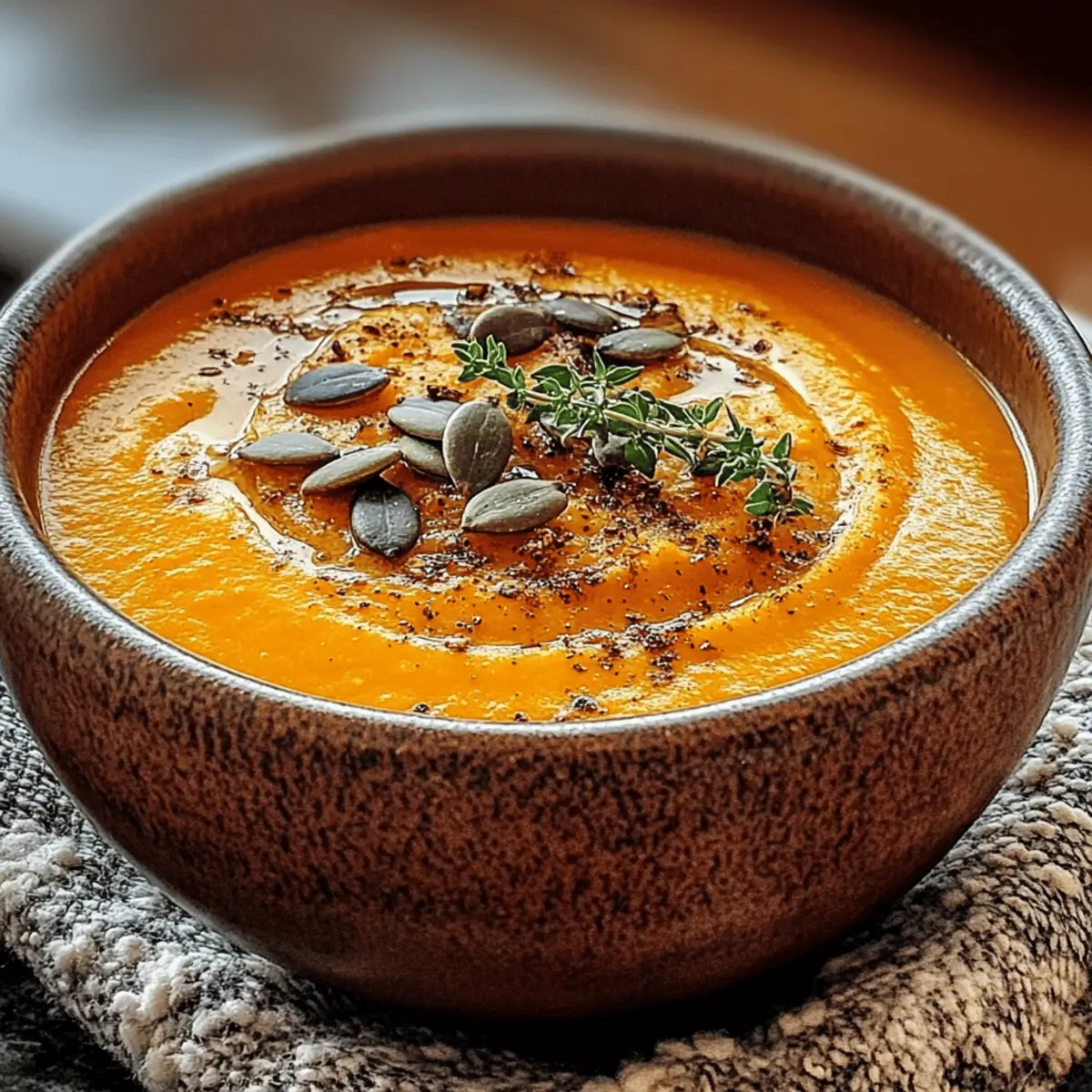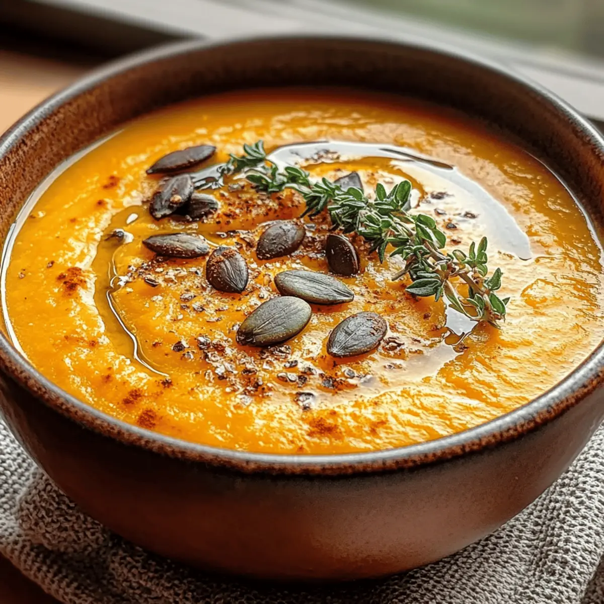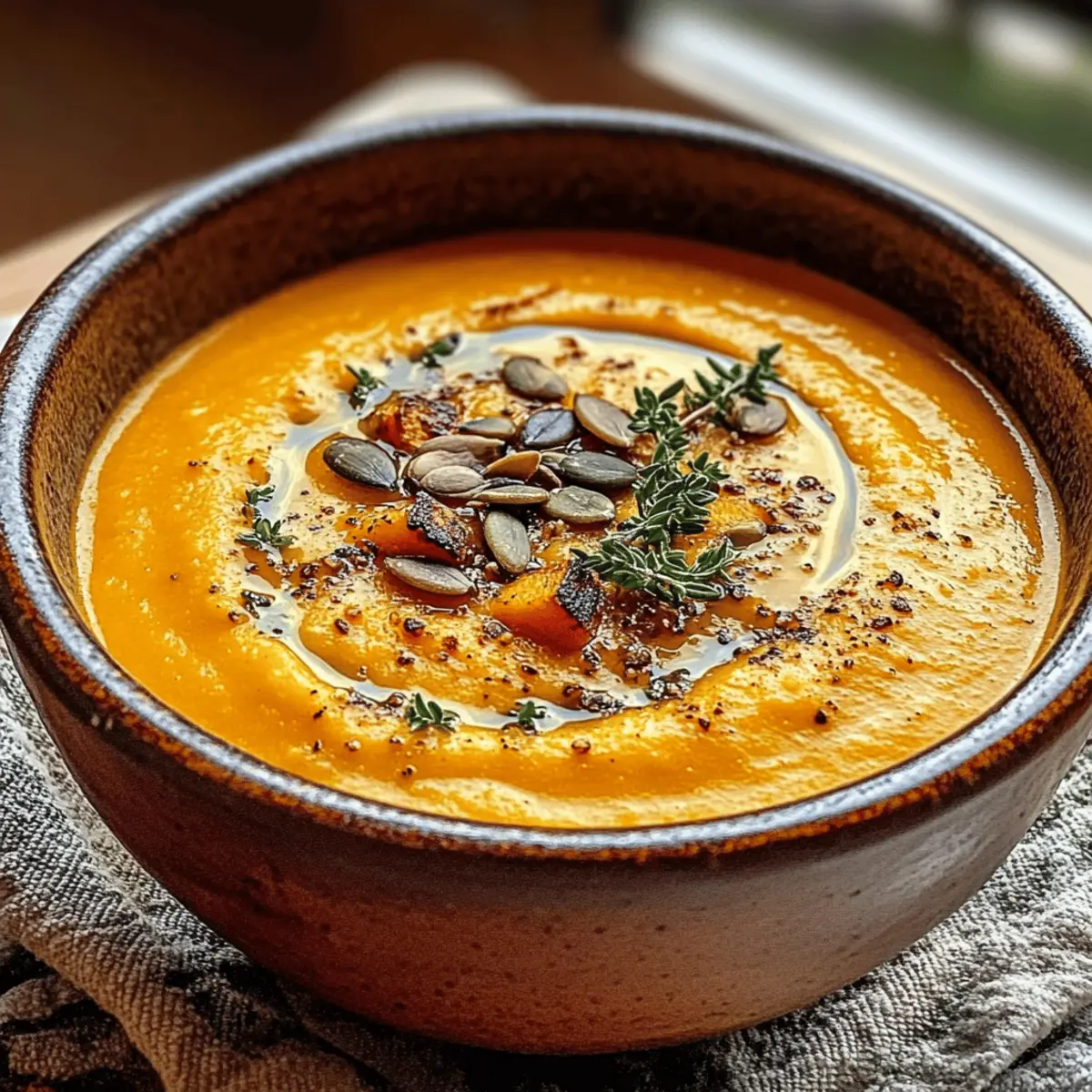 - Löffle die fertige Suppe in Schalen und garniere sie nach Belieben mit gerösteten Kürbiskernen und frischem Thymian.