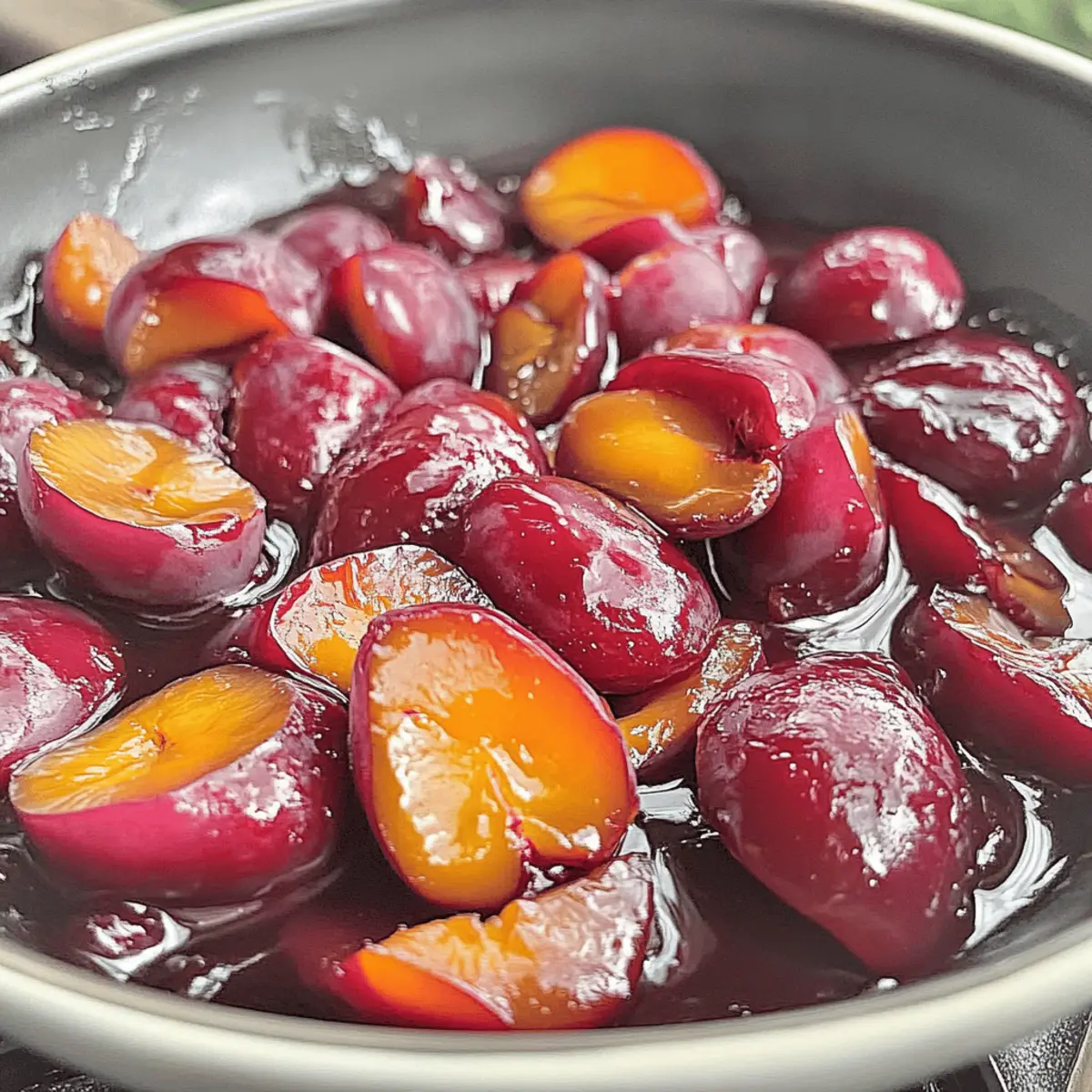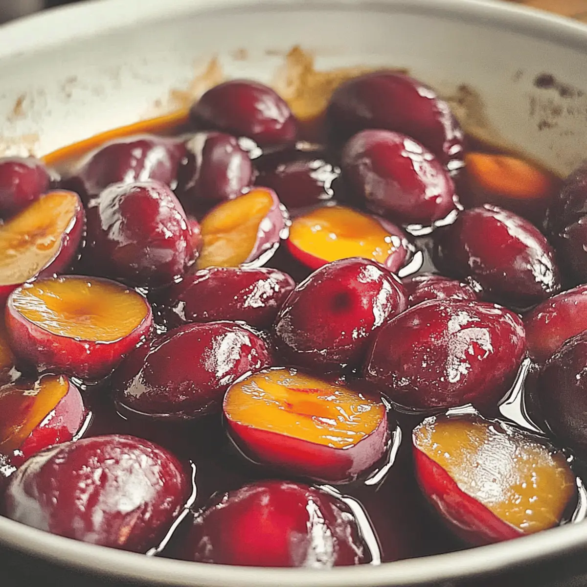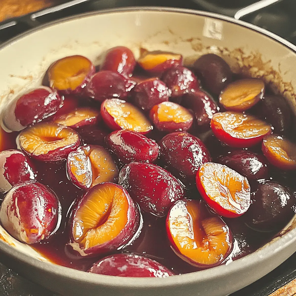 - Reduziere die Hitze und füge vorsichtig die halben Zwetschgen hinzu.